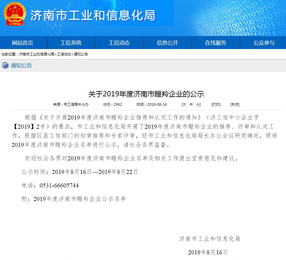 2019年8月16日濟南市工業(yè)和信息化局網(wǎng)站消息:根據(jù)《關(guān)于開展2019年度濟南市瞪羚企業(yè)推薦和認定工作的通知》(濟工信中小企業(yè)字【2019】2號)的要求,市工業(yè)和信息化局開展了2019年度濟南市瞪羚企業(yè)的推薦、評審和認定工作,根據(jù)區(qū)縣工信部門的初審?fù)扑]和專家評審,經(jīng)市工業(yè)和信息化局局長辦公會議研究確定了濟南市瞪羚企業(yè)名單,我公司成功入選。
