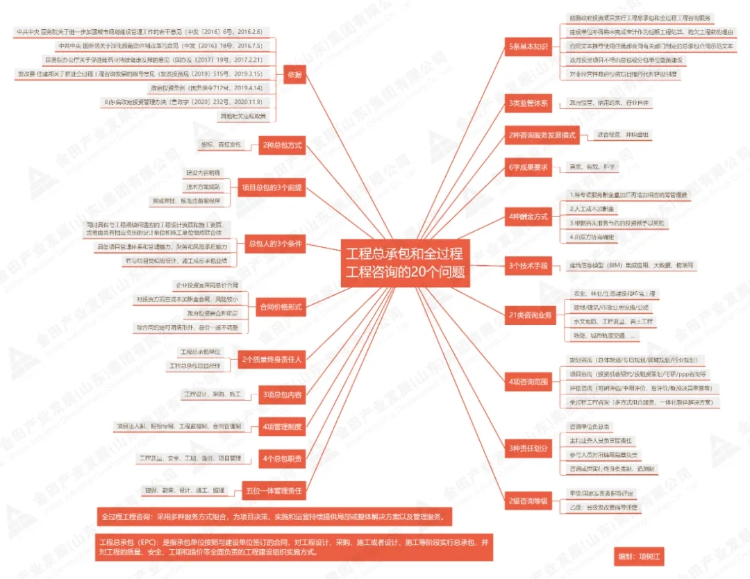 近年來(lái),國(guó)家陸續(xù)出臺(tái)了有關(guān)工程總承包和全過(guò)程工程咨詢服務(wù)的有關(guān)政策文件,各地也逐步開展了這項(xiàng)工作,為了更好地理解和把握有關(guān)政策,筆者根據(jù)相關(guān)文件,編制了20個(gè)相關(guān)問(wèn)題并以思維導(dǎo)圖的形式進(jìn)行列示,同時(shí),在思維導(dǎo)圖之后,還對(duì)幾個(gè)相關(guān)問(wèn)題進(jìn)行了解讀,如有不當(dāng),敬請(qǐng)指正。
