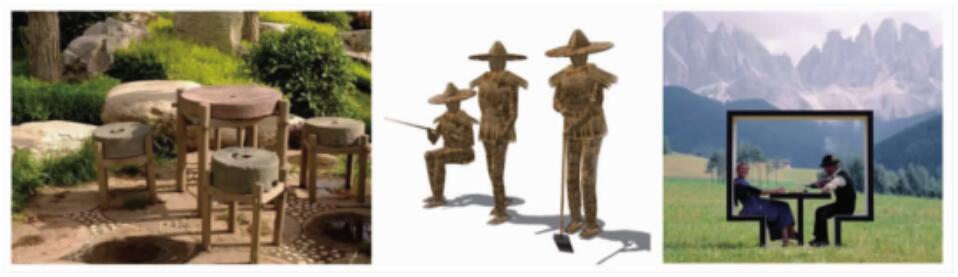 如下圖,在農(nóng)業(yè)種植設(shè)計(jì)上,按照農(nóng)田所具有的特點(diǎn),把農(nóng)作物、果樹(shù)、苗圃、花卉合理安排種植次序,展示多姿多彩的農(nóng)作物種植景觀特色,增加農(nóng)作物景觀的觀賞價(jià)值 。在田地附近的水溝、田埂、打谷場(chǎng)、貨運(yùn)碼頭等處增加一些具有服務(wù)功能的公共設(shè)施景觀資源。例如,利用傳統(tǒng)農(nóng)業(yè)景觀中的石磨、稻草人等功能性工具,重新賦予其景觀內(nèi)涵,做成桌椅、景觀小品等,點(diǎn)綴農(nóng)田景觀,既保留了其基本功能,又為農(nóng)田景觀增加了特色。同時(shí),還可適當(dāng)增加一些非鄉(xiāng)土元素凸顯農(nóng)作物景觀,豐富鄉(xiāng)村景觀類型。