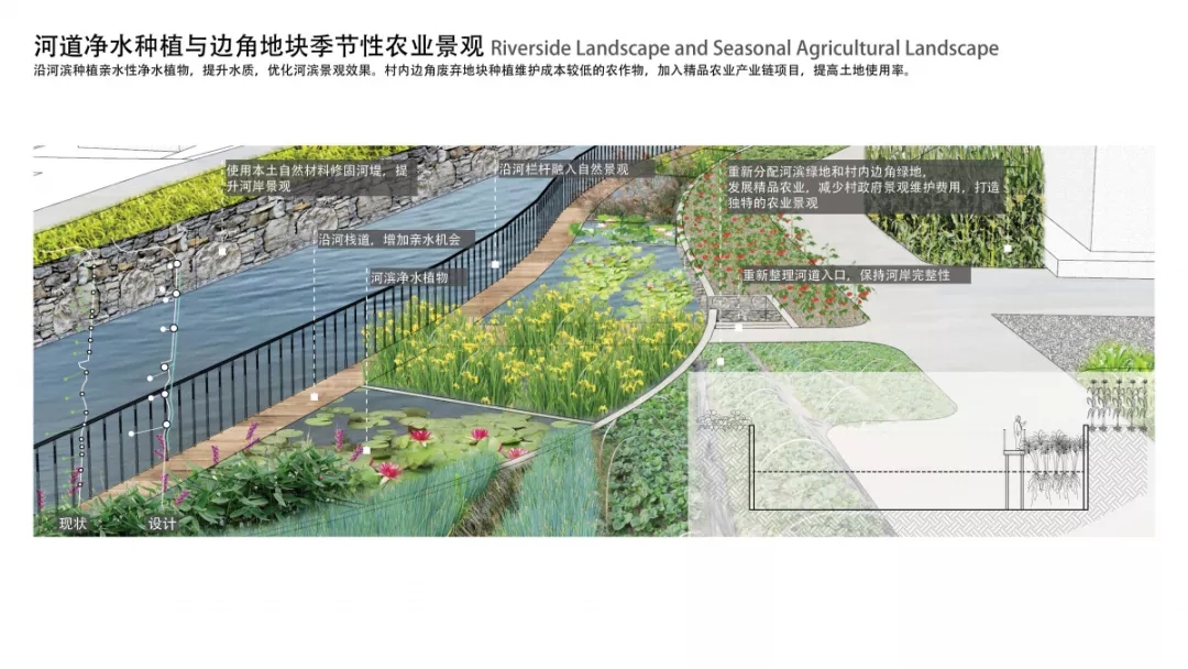 對(duì)于水體景觀的設(shè)計(jì),必須在保護(hù)其生態(tài)完整性的前提下進(jìn)行。對(duì)生態(tài)性較好的水體,可在岸邊種植觀賞性水生植物,設(shè)置臨水平臺(tái),增強(qiáng)親水性; 對(duì)水質(zhì)較差的水體,可種植有助于水體凈化的植物(如菖蒲、水蔥、鳳眼蓮等)增強(qiáng)水體自凈能力,同時(shí)修復(fù)駁岸,保護(hù)鄉(xiāng)村水生態(tài)環(huán)境的完整性。村內(nèi)邊角廢棄地塊種植維護(hù)成本較低的農(nóng)作物。