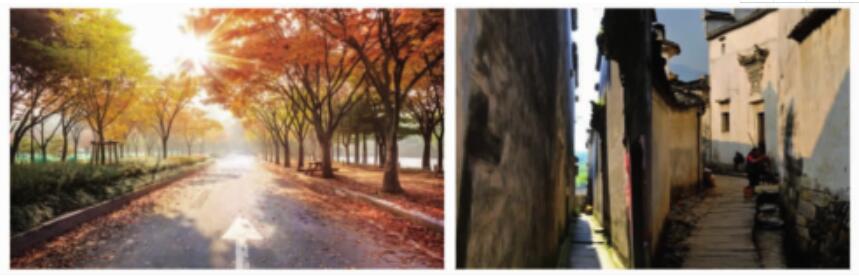 對(duì)鄉(xiāng)村道路,通過(guò)在主干道兩旁種植不同類型的植物(變化植物搭配方式),展現(xiàn)道路景觀遠(yuǎn)近變化的層次美。在巷道中,要以增加兩側(cè)建筑立面的景觀變化為主,讓人行走在巷道時(shí)可以領(lǐng)略到光線明暗的變化魅力。